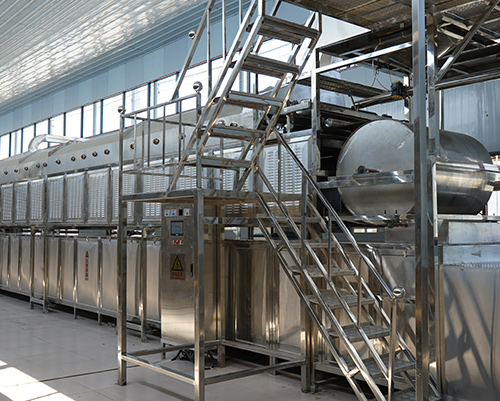 7、工藝流程:預(yù)熱→螺旋攪拌(恒溫儲(chǔ)料)→真空攪拌→刮板下料成型→蒸熟(蒸汽)→冷卻→脫離→常溫老化→低溫老化(冷庫)→豎切絲→低溫大風(fēng)量定型干燥→降溫(進(jìn)冷風(fēng))→定長橫切→包裝。